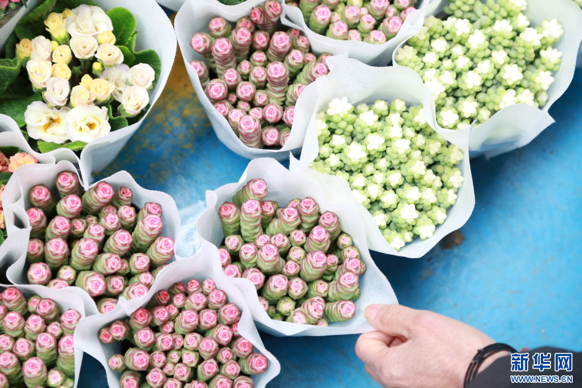 2月8日,云南昆明斗南花卉市场内等待售出的鲜花和多肉植物。新华网发(薛莹莹 摄)