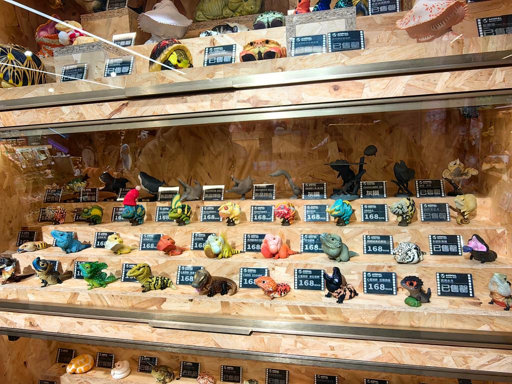 和琳琅满目的“星云海鲜”一样引人注目的,是一整面玻璃墙的动物手办,一个个手掌大小的动物手办,有着圆滚滚的外表,身上的色彩细节栩栩如生。