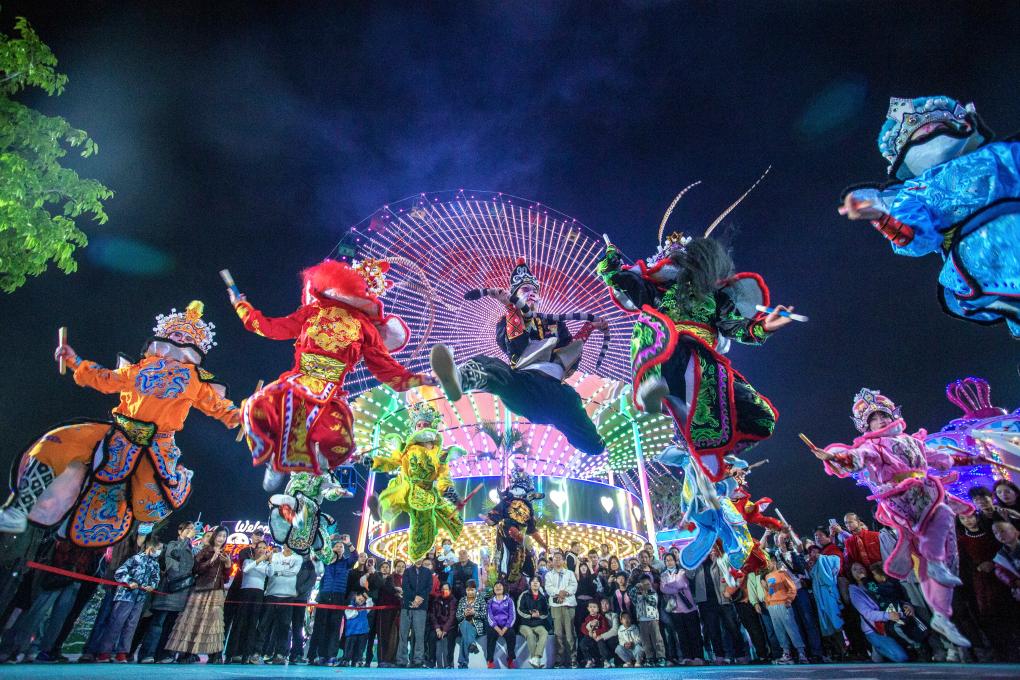 2026年2月19日,英歌舞队在广东省佛山市高明区滨荷Park生态文创园街头巡游表演。
