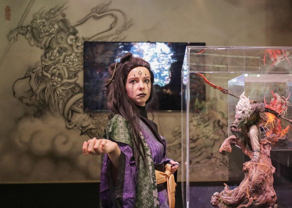 2025年8月20日,在德国科隆,一名《黑神话:悟空》游戏角色扮演者在游戏科学展台与模型合影。