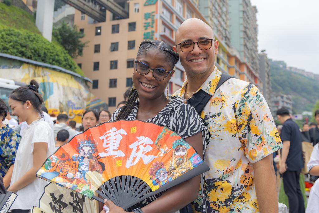 2025年10月3日,加拿大游客克里斯提安(左)和家人在重庆市渝中区李子坝游玩。近年来,不断优化的入境政策为境外游客赴华提供了更多便利,“来华旅游攻略”“赴华购物清单”等成为国外社交媒体热门搜索关键词,“China Travel”的热度延续至今。山城重庆凭借其独特的城市景观和风土人情,吸引不少外国游客前来品尝美食、打卡景点、体验文化。