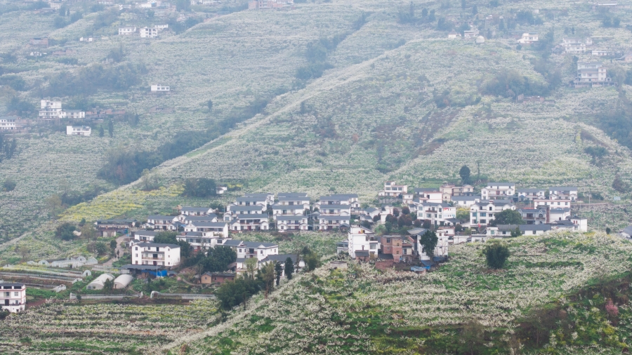 从高空俯瞰绥江县新滩镇天宝山的万亩李园,田间地头、村头寨尾、溪旁路边都被雪白的李花覆盖。近年来,绥江县依托“半边红”李子产业,大力发展乡村旅游,将李花观赏、李子采摘与乡村旅游相结合,走出了一条农旅融合发展之路。目前,绥江县10万亩“半边红”李子已形成沿金沙江3个万亩基地和6个千亩基地的规模化种植格局。