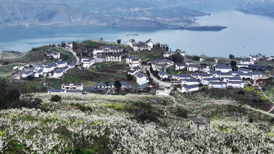 李花、村庄、金沙江相互映衬(3月1日摄)。