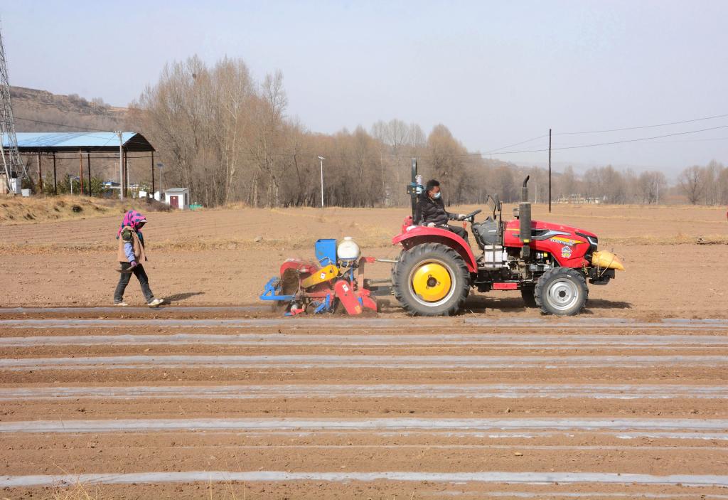 3月23日,青海省海东市民和回族土族自治县古鄯镇夏家河村村民正驾驶农机进行土地覆膜作业。新华社记者 王浡 摄