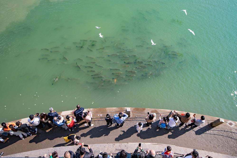 市民在三江口观赏红嘴鸥和鱼群。新华社发(彭珉翔 摄)