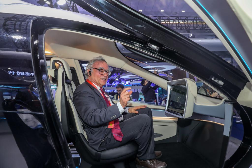 一名外国嘉宾在宜宾举办的2025世界动力电池大会上感受电动飞行汽车。新华社发(庄歌尔 摄)