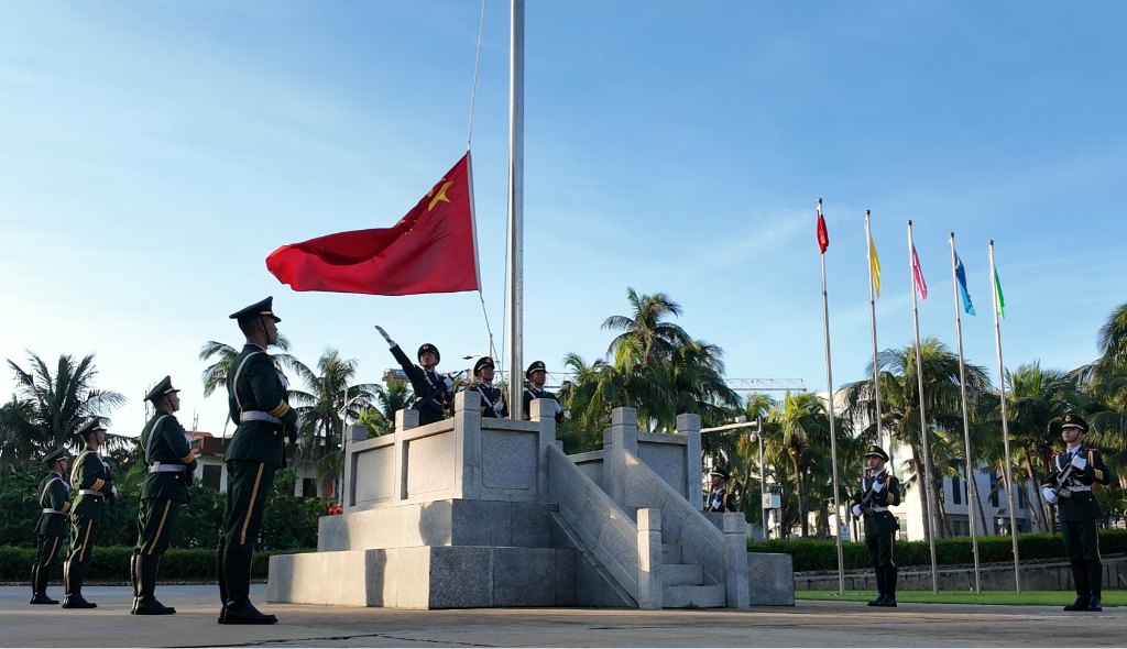 三沙市政府广场上,工作人员、驻岛官兵、岛上居民整齐列队,神情肃穆。