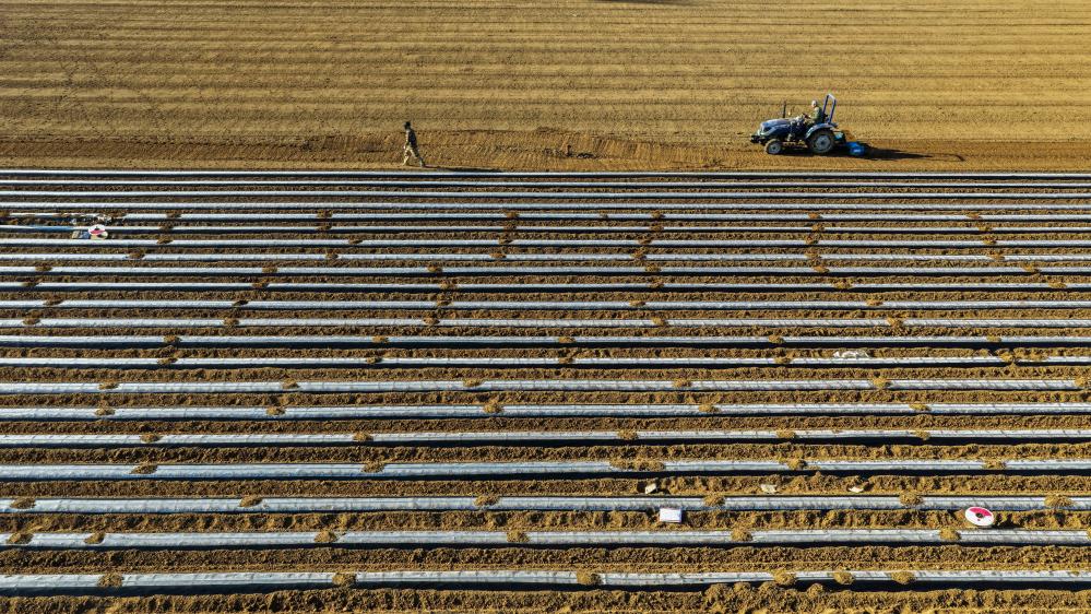 4月7日,河北省遵化市东新庄镇农民驾驶农机在田间耕作(无人机照片)。新华社发(刘满仓摄)