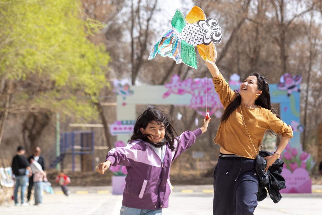 4月4日,人们在新疆泽普县金胡杨景区放风筝。新华社发(张昀摄)