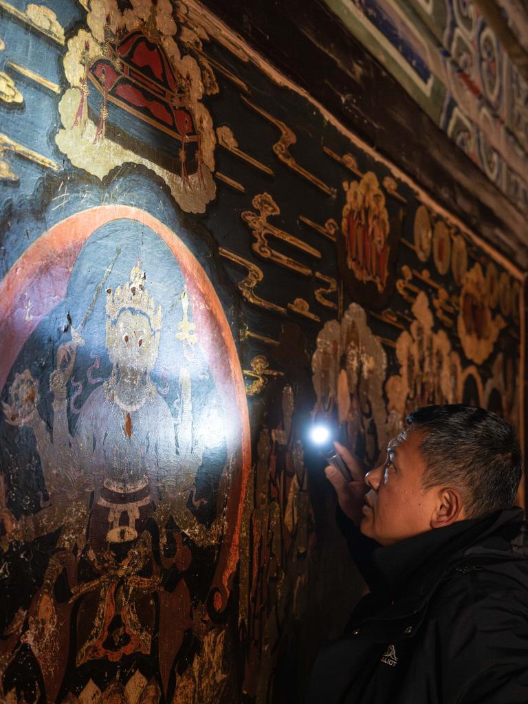 1月16日,工作人员在云南省丽江市玉龙纳西族自治县白沙镇白沙壁画博物馆查看壁画情况。新华社记者高咏薇摄