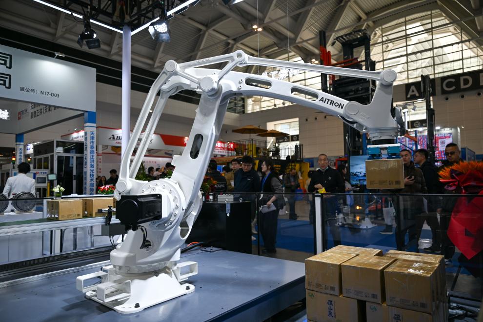 3月18日,一台搬运机械臂在天津工博会上向观众进行演示。新华社记者孙凡越摄
