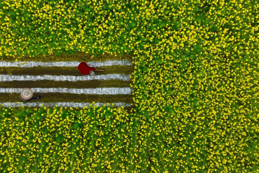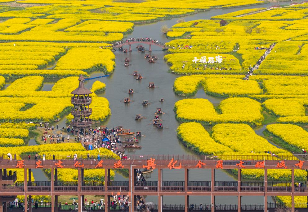 4月4日,游客在江苏省兴化市千垛景区赏花游玩(无人机照片)。新华社发(周社根摄)
