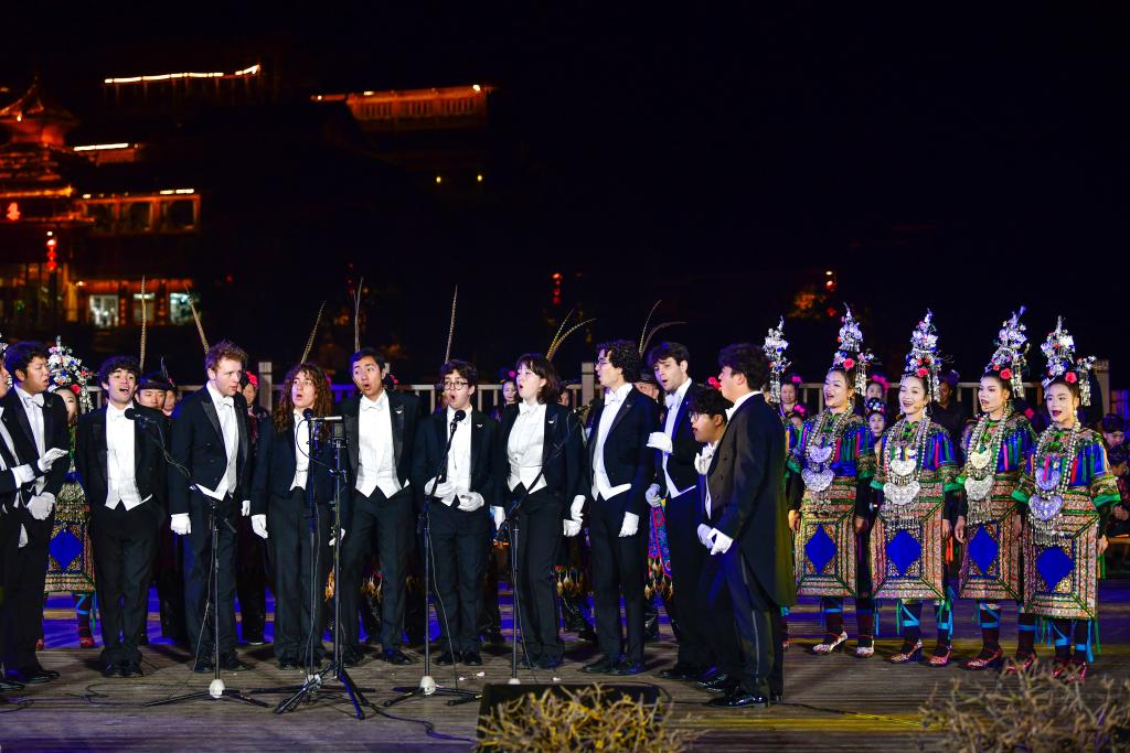3月23日,在贵州省黎平县肇兴侗寨,美国耶鲁大学威芬普夫斯阿卡贝拉合唱团与贵州“村歌”合唱团同台演唱歌曲。新华社记者杨文斌摄