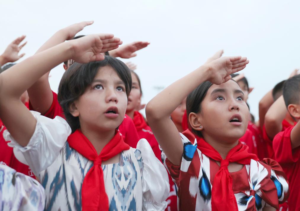 2025年7月31日,两位小朋友在天安门广场的升旗仪式上敬礼。新华社发(张利民摄)