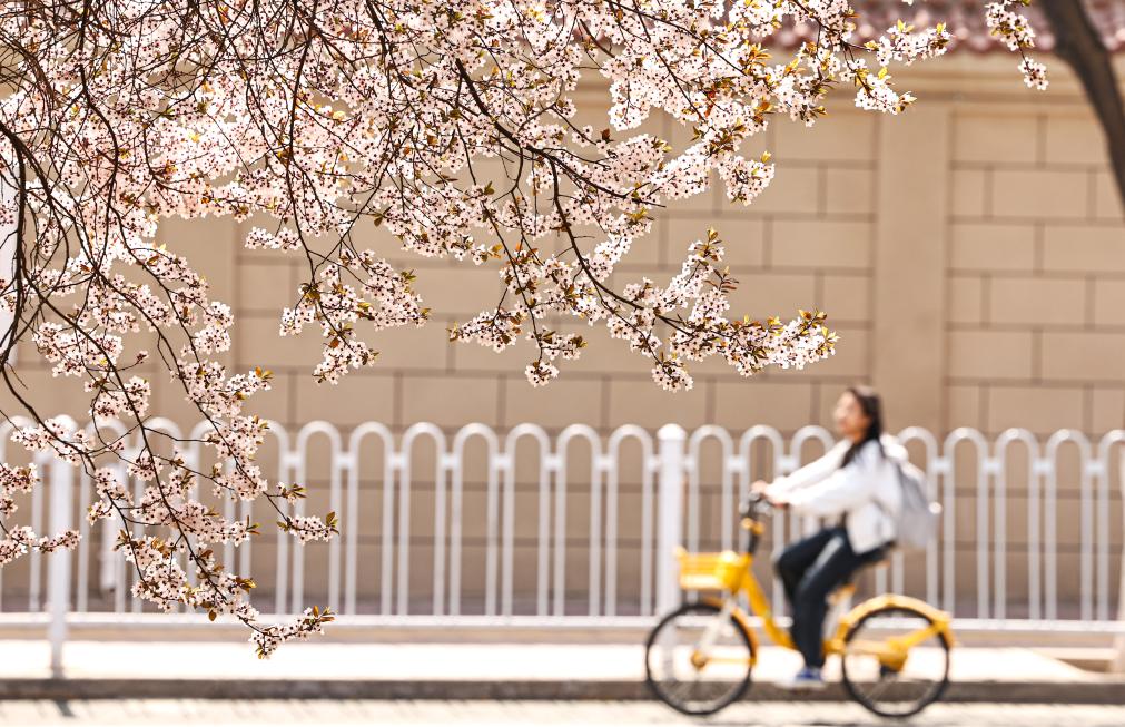 4月2日,一名女子在甘肃省兰州市城关区读者大道骑车出行,路边的紫叶李花开正盛。新华社发(侯崇慧摄)