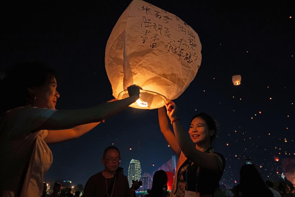 4月13日,游客在澜沧江畔点亮孔明灯。新华社记者 江文耀 摄
