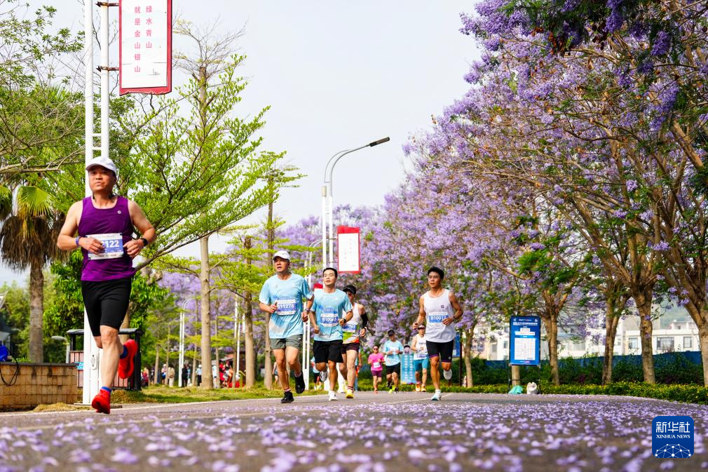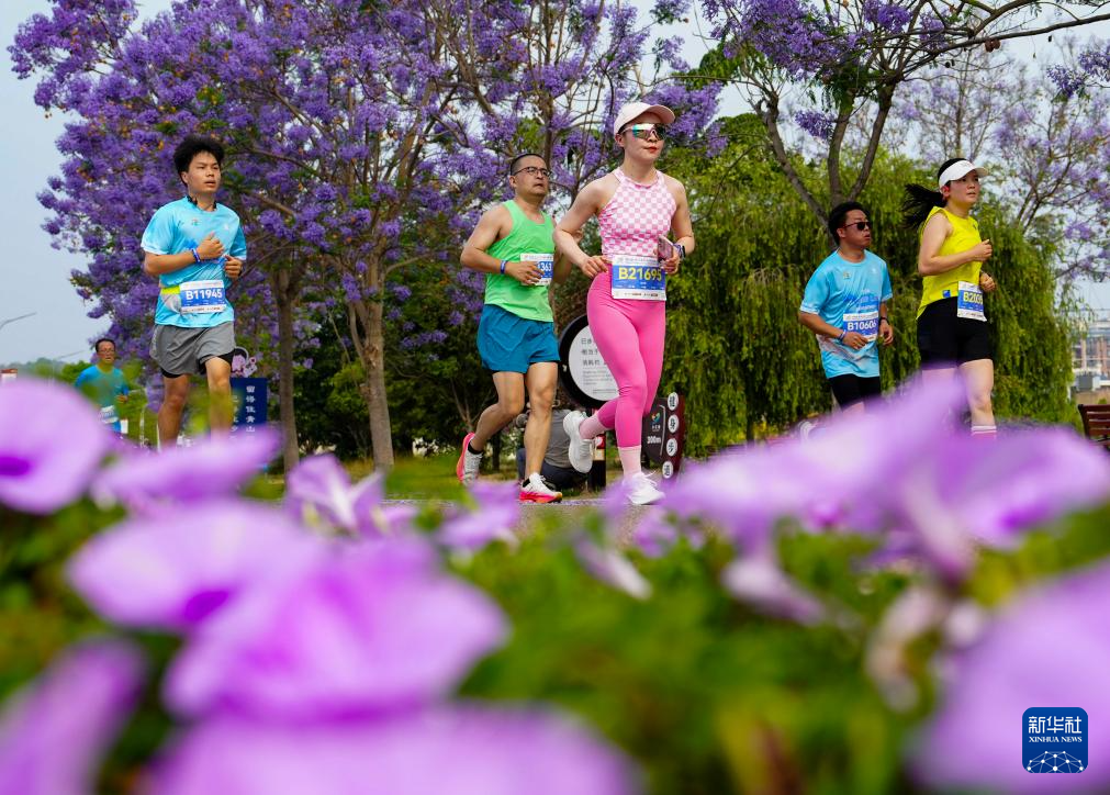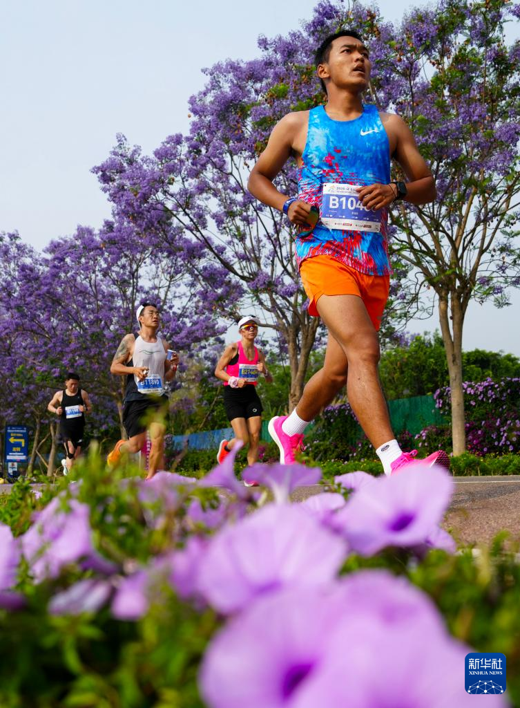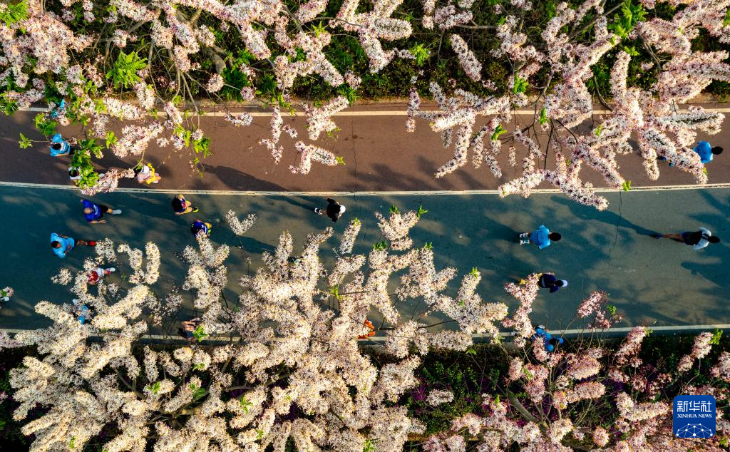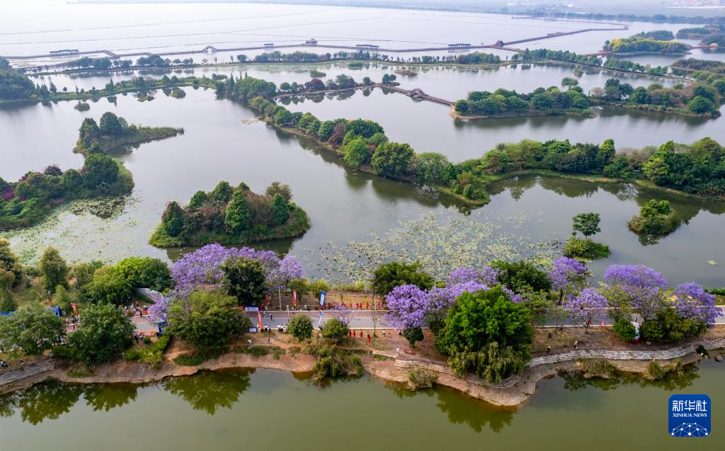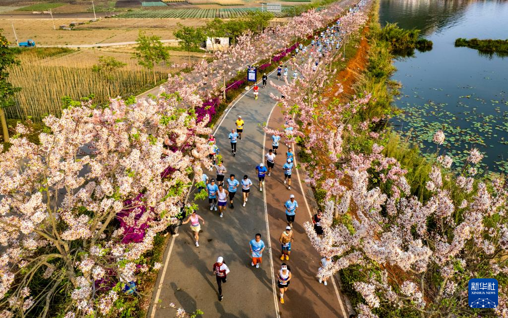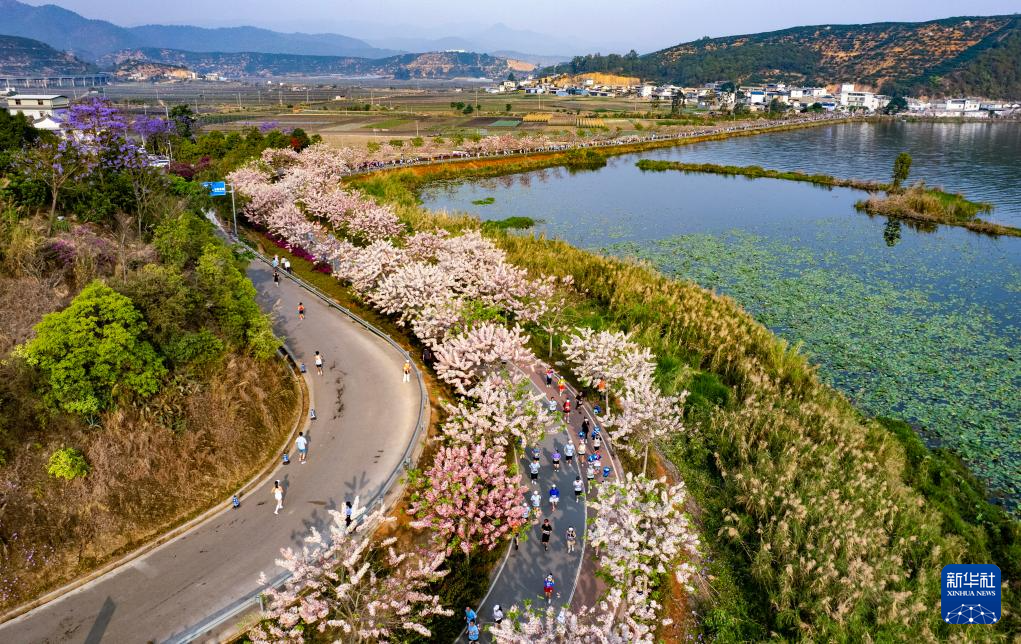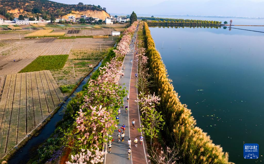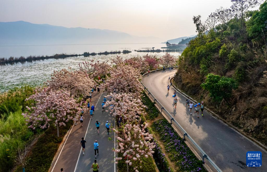 4月19日,参赛选手在异龙湖畔的马拉松赛道比赛(无人机照片)。新华社记者 陈欣波 摄