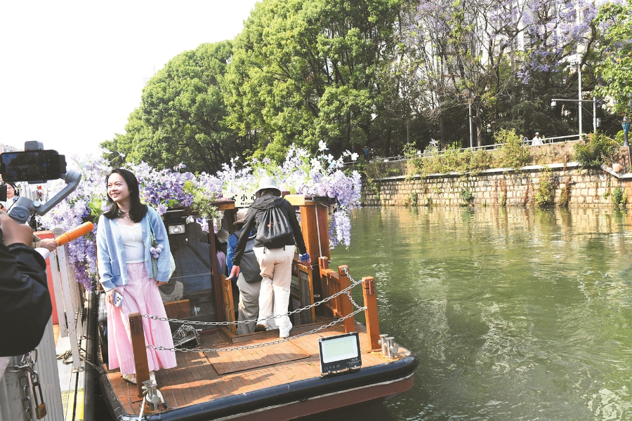 图为市民、游客乘船观赏盘龙江两岸蓝花楹。赵伟 刘凯达 摄